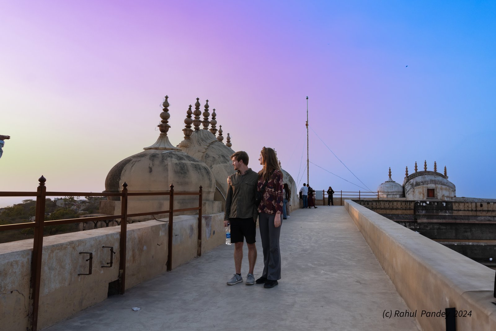 Monks (Lamas) photographing other colleagues with Leh in background, from Shanti Stupa terraces in Ladakh, India